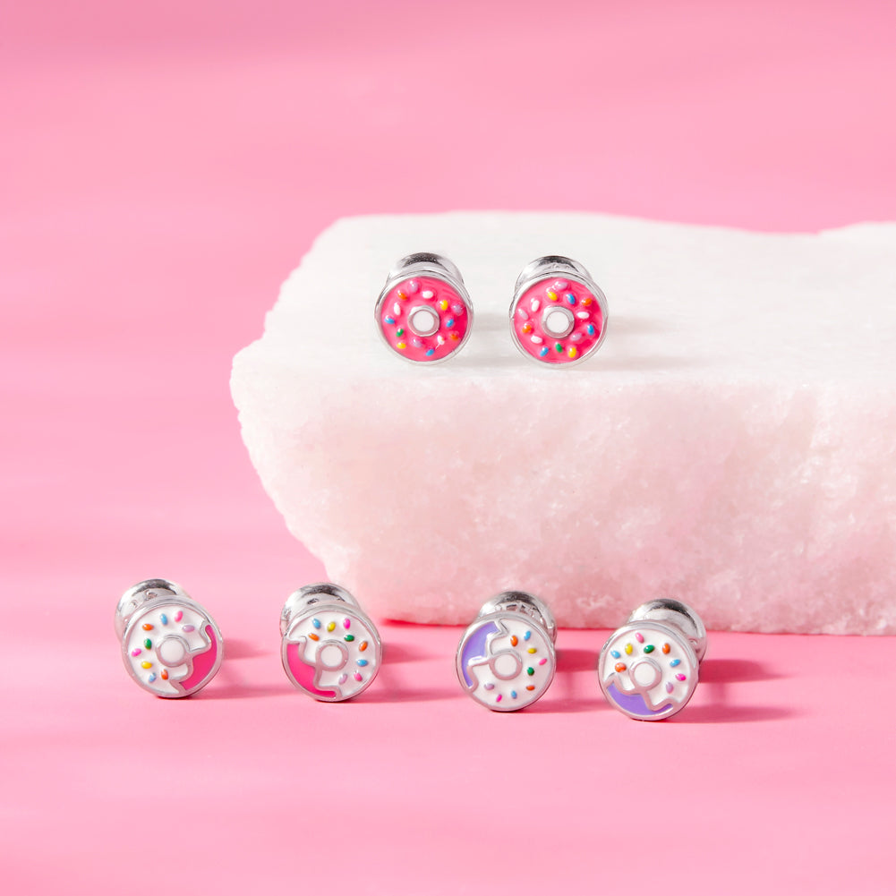 This beautiful pair of donut earrings are a timeless and elegant addition to your young girl's fun and fashionable jewelry collection. Crafted in 925 sterling silver which is suitable for those with sensitive ears, they are secured with safety and secured screw backs for children. These donut earrings feature bright and colorful enamel colors for a more fashionable look. Buy a pair for someone special in your life and this pair of earrings will be cherished for a long time. A complimentary Window Box is included.