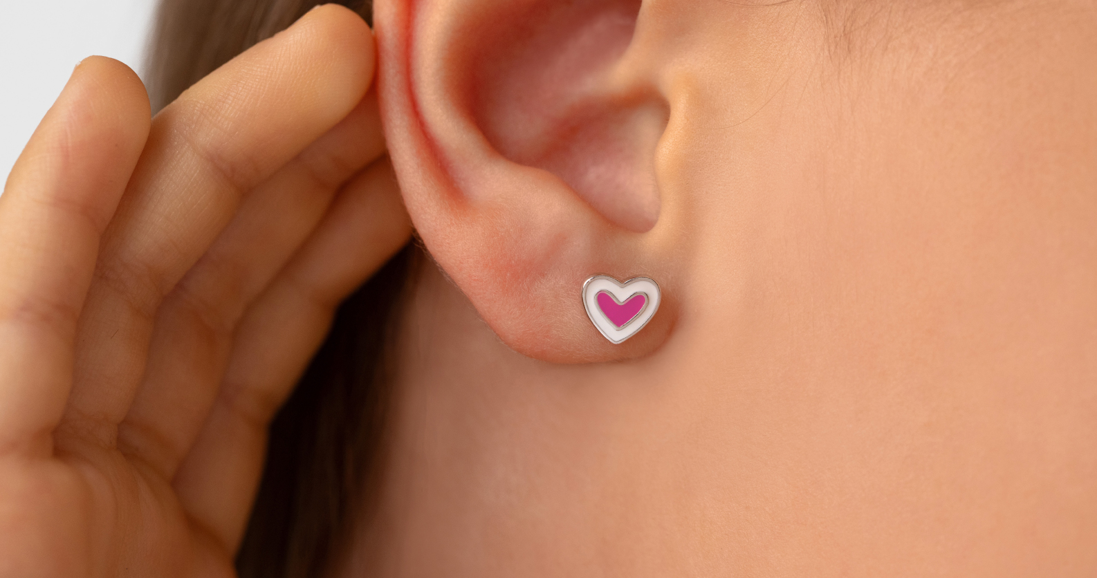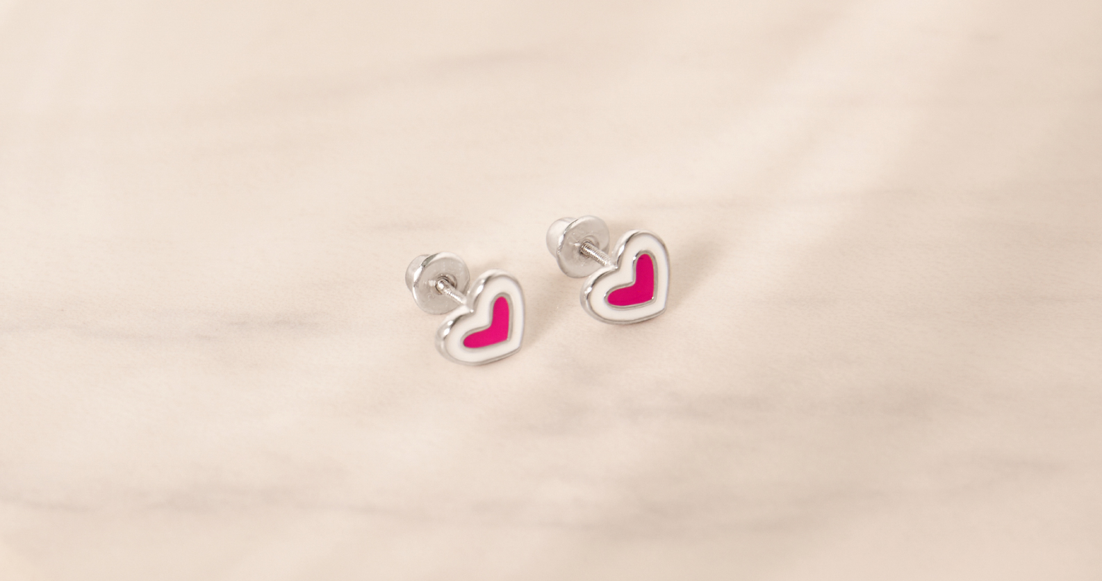Adorned in delicate pink hues, these charming earrings for girls are expertly crafted from 925 sterling silver. Featuring enchanting pink and white enamel hearts, these small safety screw back earrings ensure both style and security. The safety screw back mechanism ensures they stay comfortably in place, making them a lovely choice for your young girl. This pair of heart earrings serves as a meaningful gift for a loved one and comes neatly packaged in its own little Window Box for your convenience.