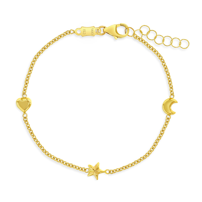 This darling little girls' bracelet is sure to become her favorite accessory. Crafted from 14k yellow gold, it's safe for sensitive skin and designed with fun shapes that are eye catching for toddler girls. Featuring polished puffed heart, moon and star charms, this bracelet adds a playful touch to any outfit. Measuring 5 inches with an additional 1-inch extension, it's adjustable to fit comfortably on her wrist. The bracelet is made with attention to detail, ensuring a high-quality accessory that's great for everyday wear or special occasions. Give the gift of charm and let your little girl shine bright with this adorable bracelet. Window Box included with purchase.