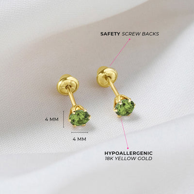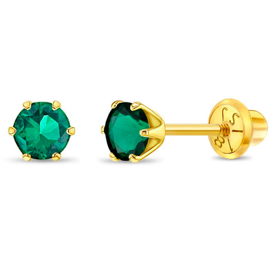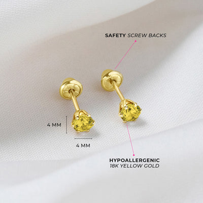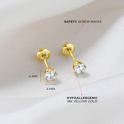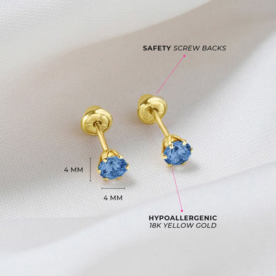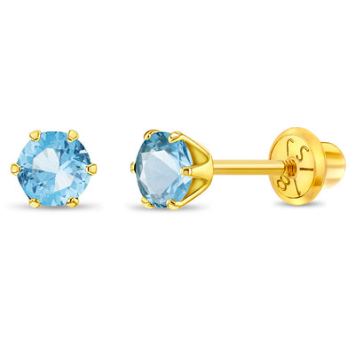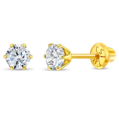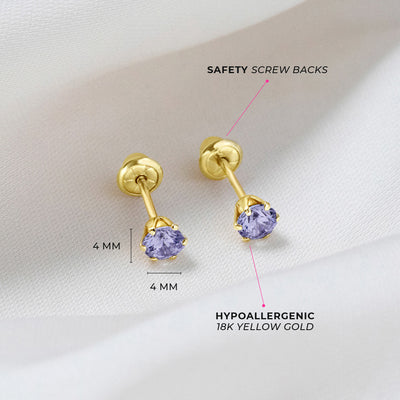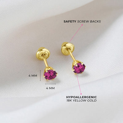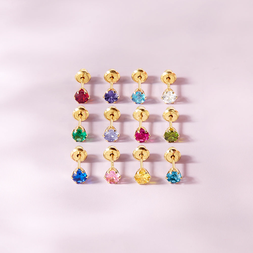 For your daughter’s first studs, you can’t go wrong with these 18k yellow gold simulated birthstone earrings. The prong style allows the CZ stone to shine brightly all day and night. These gold earrings for baby girls have screw back fasteners that keep them on your child’s ears no matter how playtime gets. These earrings are suitable for your child's sensitive ears so you don’t have to worry about the posts irritating your toddler’s lobes. This delightful pair of earrings comes packaged with a Window Box.