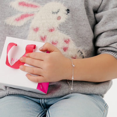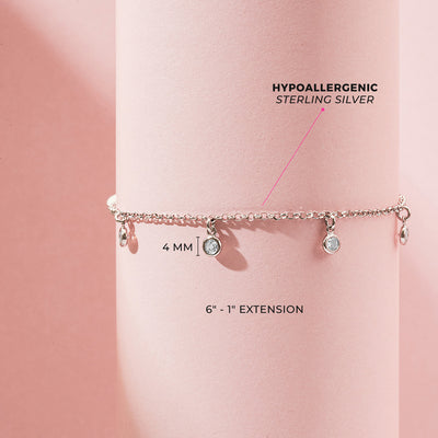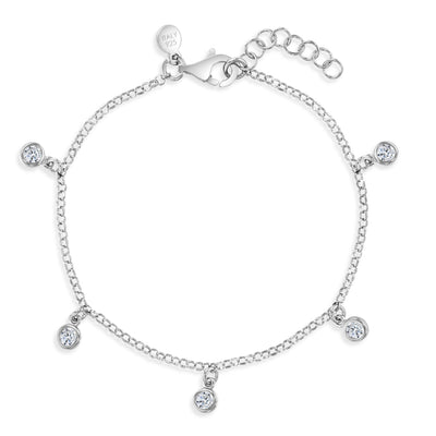 Delicate and enchanting, this dainty bracelet adorns a little girl's wrist with elegance. Crafted from 925 sterling silver, it boasts a hypoallergenic quality, ensuring it's gentle on sensitive skin. The link chain features multiple tiny bezel-set cubic zirconia charms, sparkling delicately as they catch the light. With a length of 6" and an additional 1" extension, this bracelet is designed to grow alongside cherished memories, making it a timeless keepsake for any young girl to treasure. A complimentary Window Box is included.
