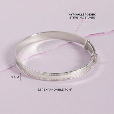 This delicate bangle bracelet is a sweet addition to any little girls jewelry collection. Featuring a polished and simple look, this bangle bracelet is crafted with a 925 sterling silver an ideal material for toddler girls with sensitive skin. An ideal gift for a baby shower, birth gift, or a baby in your family or circle of friends. A complimentary Window Box is included.