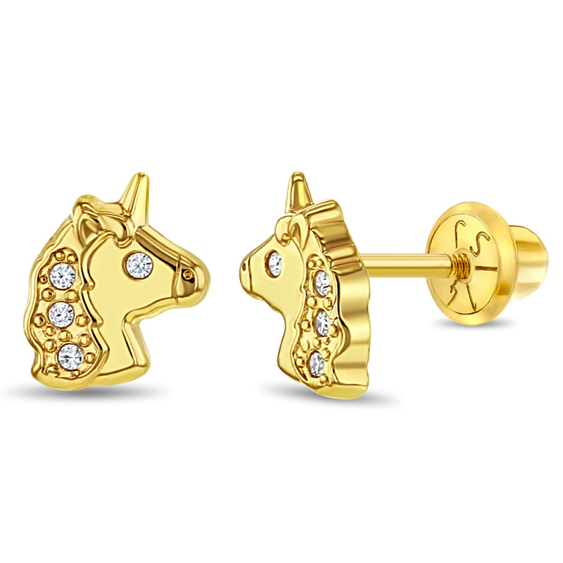 Add a smile to your little girls face with this sweet pair of unicorn screw back earrings. An adorable unicorn that shines with cute clear cubic zirconia stones, ideal for young girls with vibrant imaginations. These lovely unicorn earrings are crafted from fine 14k yellow gold and detailed with clear cubic zirconias stones. They feature safety screw back locking so they sit safely and comfortably onto your little ones ears. Window Box is included.