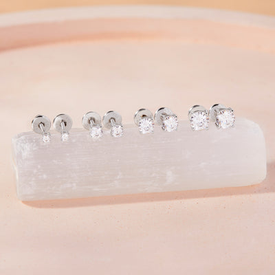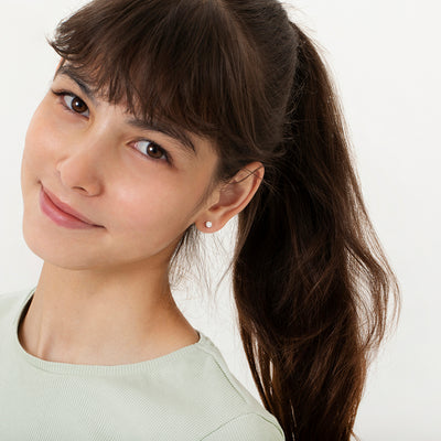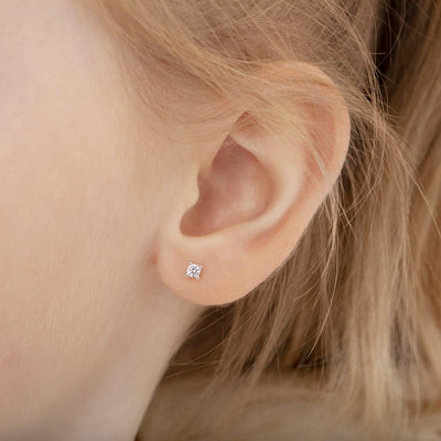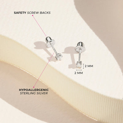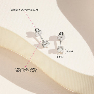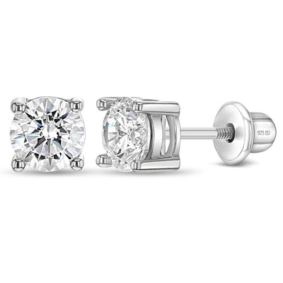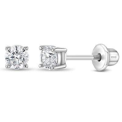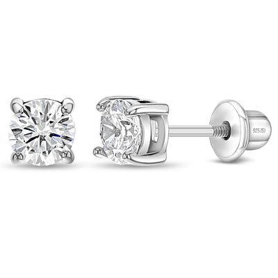 Make a brilliant statement of style for your little princess with these shimmering clear CZ solitaire stud earrings for little girls of all ages. Handcrafted entirely of 925 sterling silver, these earrings are hypoallergenic, nickel-free, and safe for children with sensitive ears. The quality clear cubic zirconia stone is mounted using a classic four-prong jeweler's setting. The threaded safety backs and posts are designed to keep your child's earrings comfortably and safely in place at all times. A complimentary Window Box is included for easy giving!