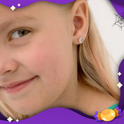 Add a touch of enchantment to your little girl's Halloween ensembles with these captivating crescent moon screw-back earrings. Featuring a mesmerizing iridescent simulated opal at their heart, these crescent-shaped earrings are sure to cast a spell of charm. These earrings come equipped with a secure screw-back locking mechanism, ensuring they stay firmly in place throughout her magical adventures. And as a special treat, a bewitching Window Box is included with your purchase to make this Halloween even more memorable!